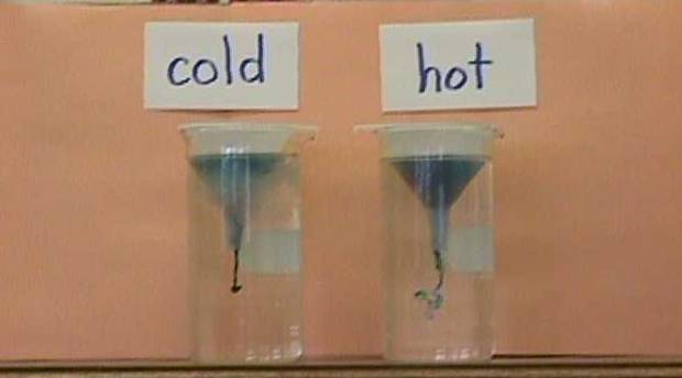 There are funnels in both 1000 ml. beakers of hot and cold water.